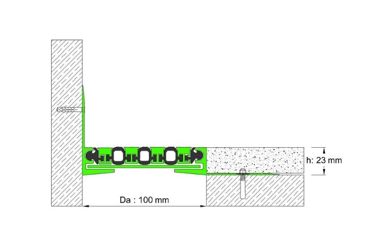100 mm DİLATASYON BOŞLUKLARI İÇİN, 23 mm YÜKSEKLİĞİNDE KAPLAMA ALTI ZEMİN DİLATASYON PROFİLİ