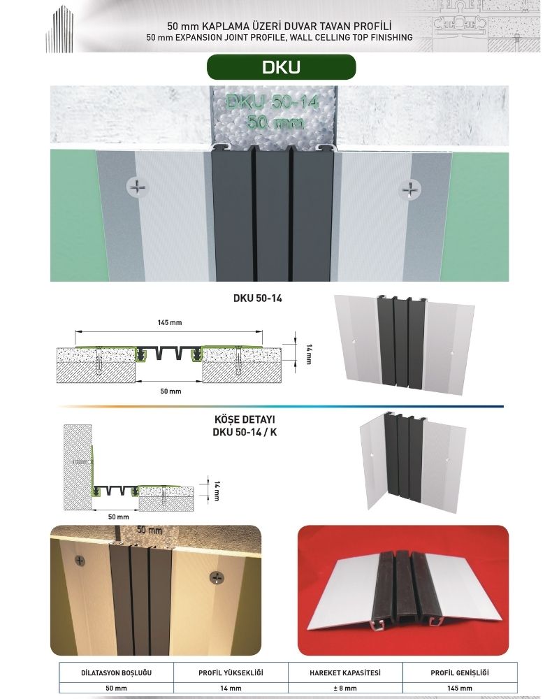 50 mm DİLATASYON BOŞLUKLARI İÇİN SIVA ÜZERİ DUVAR TAVAN DİLATASYON PROFİLİ