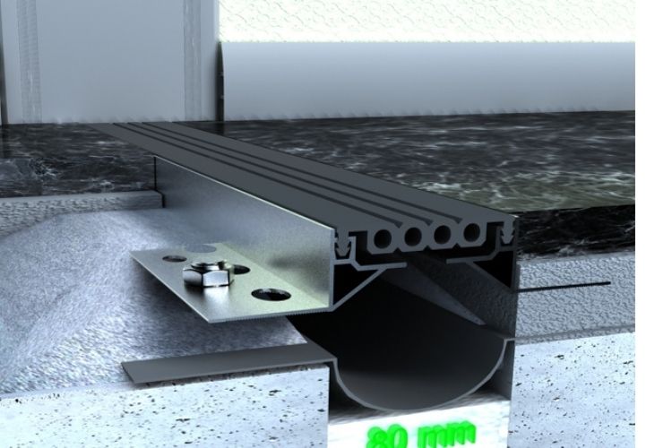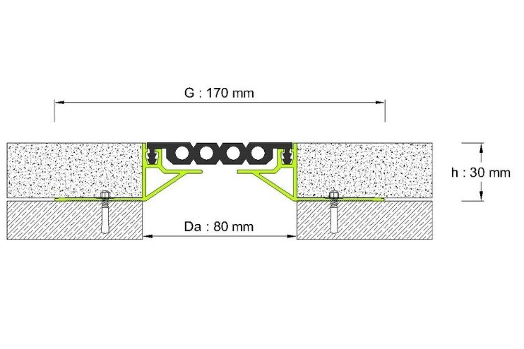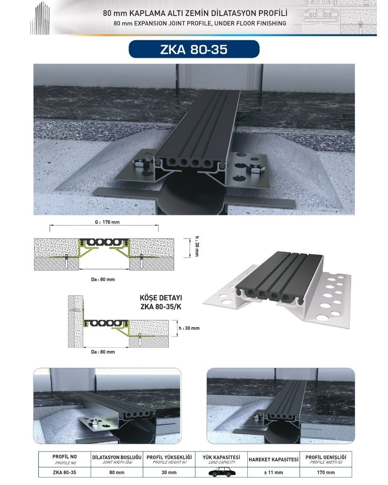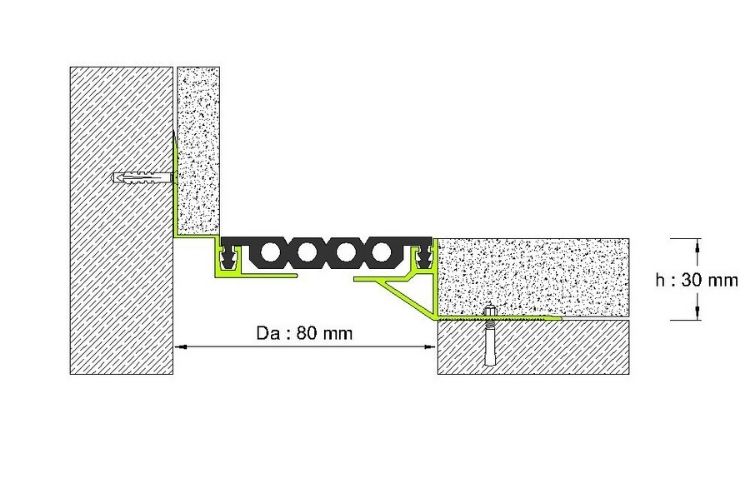 80 mm DİLATASYON BOŞLUKLARI İÇİN, 30 mm YÜKLSEKLİĞİNDEKAPLAMA ALTI ZEMİN DİLATASYON PROFİLİ